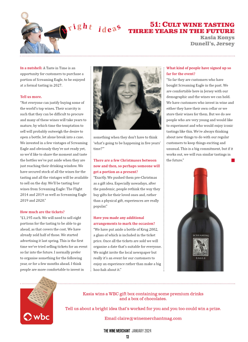 Super delighted that Kasia has won this month’s ‘Bright Ideas’ prize in January’s The Wine Merchant for our ‘Taste in Time’ event happening in 2027. It’s a totally unique tasting.