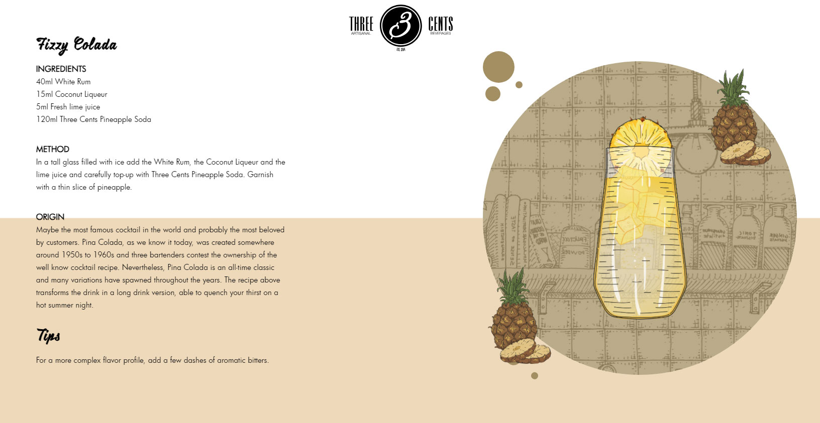 Method - In a tall glass filled with ice add the White Rum, the Coconut Liqueur and the lime juice and carefully top-up with Three Cents Pineapple Soda. Garnish with a thin slice of pineapple.