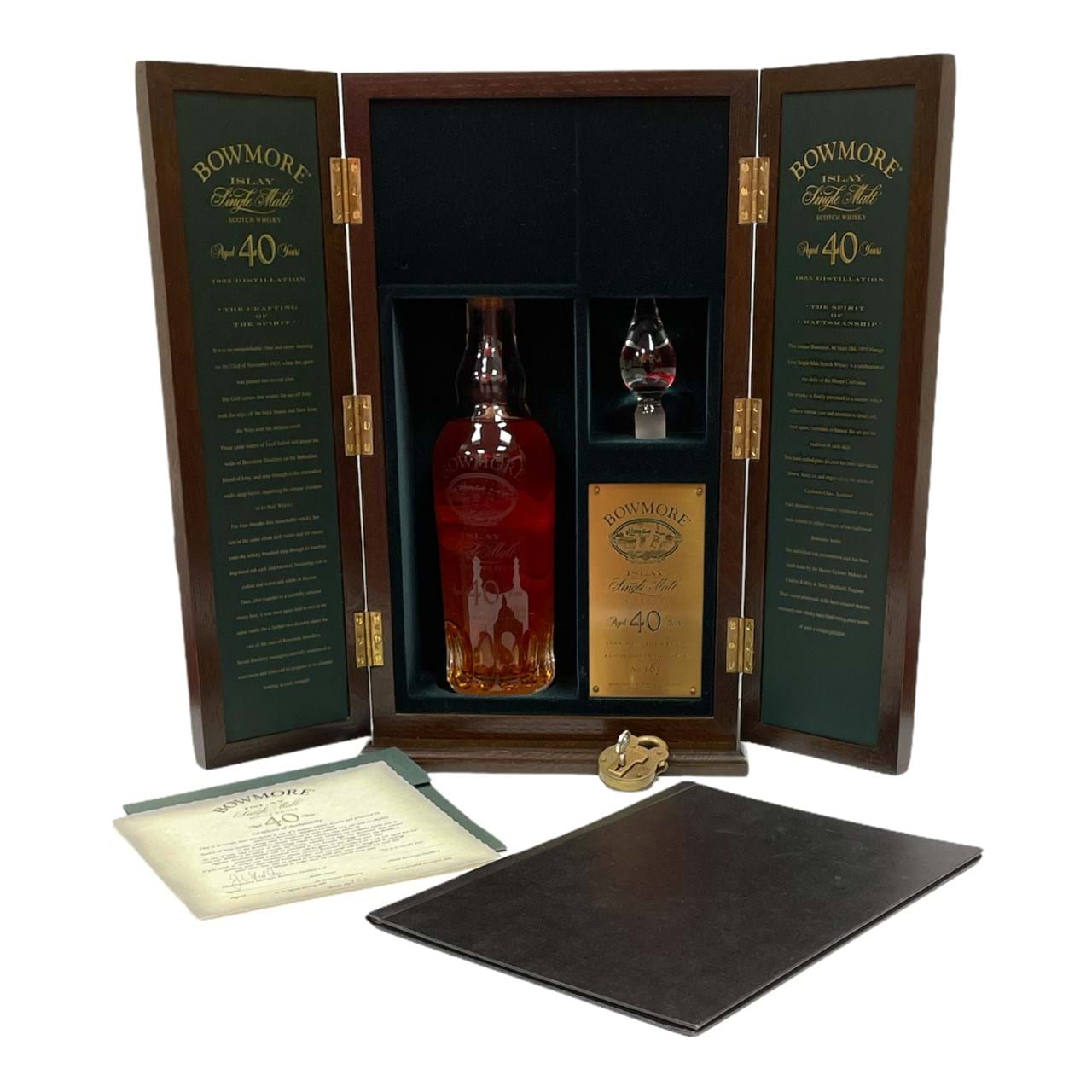 This unique Bowmore, 40 Years Old, 1955 Vintage, Islay Single Malt Scotch Whisky is a celebration of the skills of the Master Craftsman. The whisky is finally presented in a manner which reflects similar care and attention to detail and, once again, continues to honour the art and the tradition of such skills. This hand crafted glass decanter has been individually blown, hand cut and engraved by the artists of Caithness Glass, Scotland. Each decanter is individually numbered and has been created to reflect images of the traditional Bowmore bottle. The individual oak presentation case has been hand made by the Master Cabinet Makers of Charles Kirkby & Sons, Sheffield, England. Their world renowned skills have ensured that this extremely rare whisky has a final resting place worthy of such a unique pedigree.