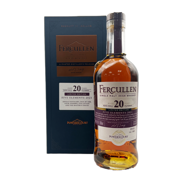 The eagerly anticipated new arrival to the Fercullen 'Five Elements' series is this limited edition 20-year-old single malt. Following on from the huge success of the 2020 18-year-old bottling of the first of the 'Five Elements' series, this is a limited release of just 1,500 bottles. This is a marriage of 5 different cask styles expertly combined by Noel Sweeney to create a distinctive and complex whiskey. 16-year-old bourbon barrel-matured malt whiskey has been finished for four years in a variety of Oloroso sherry, Pedro Ximenez, Marsala and Muscatel casks, before marrying with 20-year-old Bourbon matured Single Malt. Five styles expertly combined by a Master’s touch, producing a symphony of flavour in this rare and inimitable Single Malt Irish Whiskey.